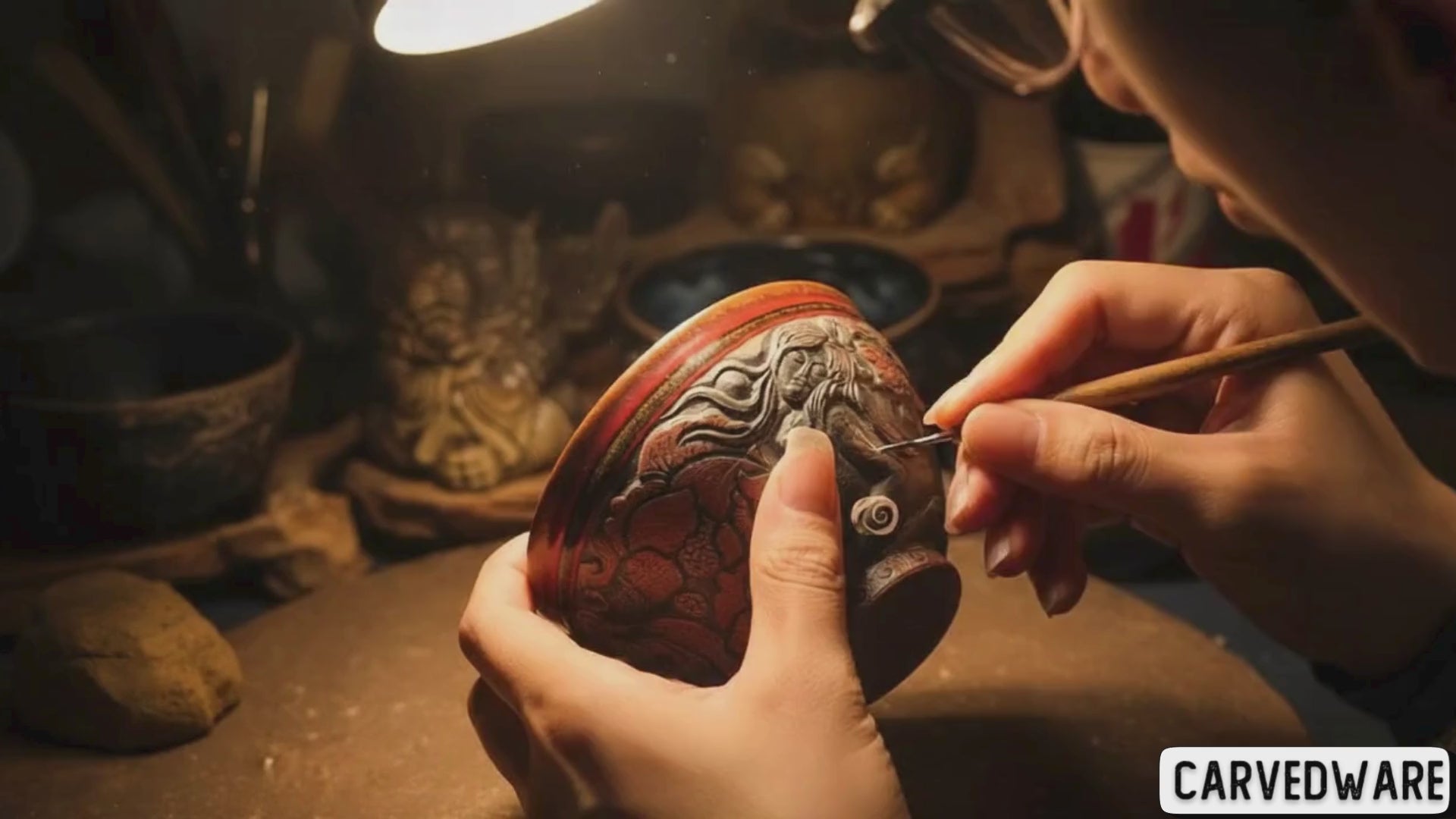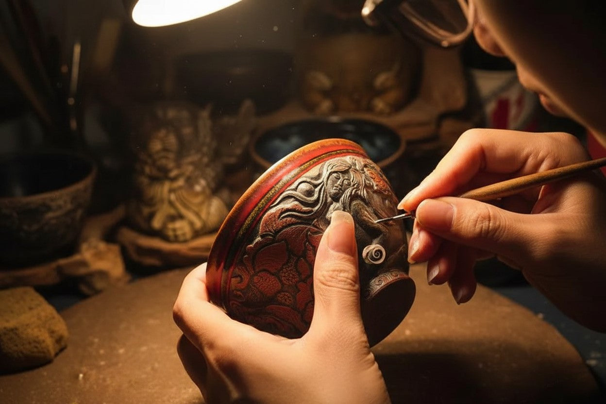 Using loop tools, V-shaped blades, and fine knives, the artisan carves the motif with precision and sensitivity.